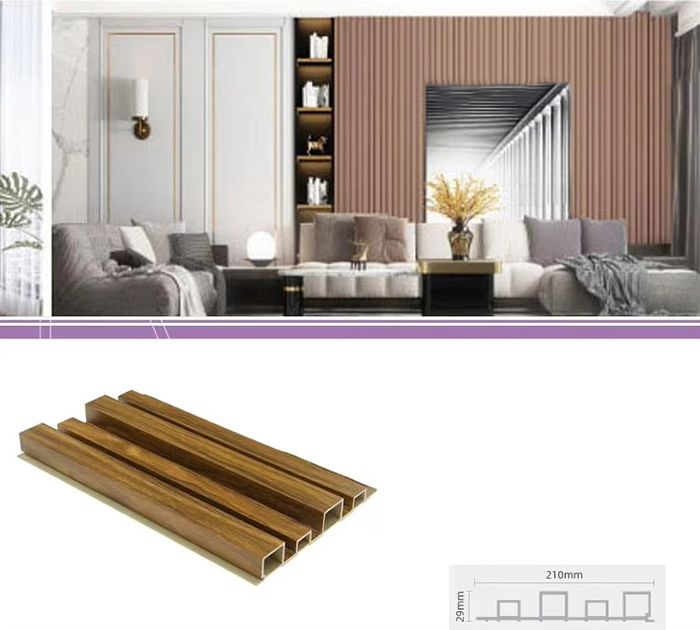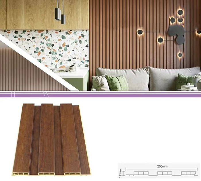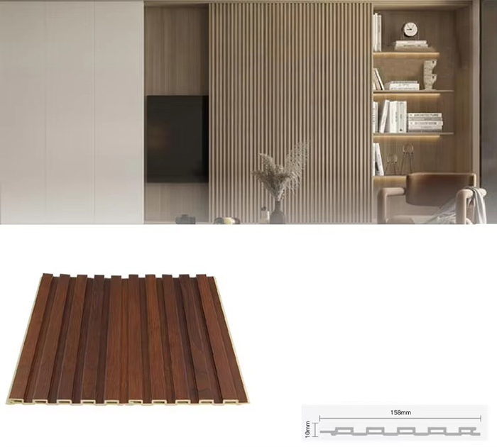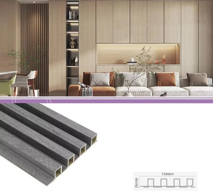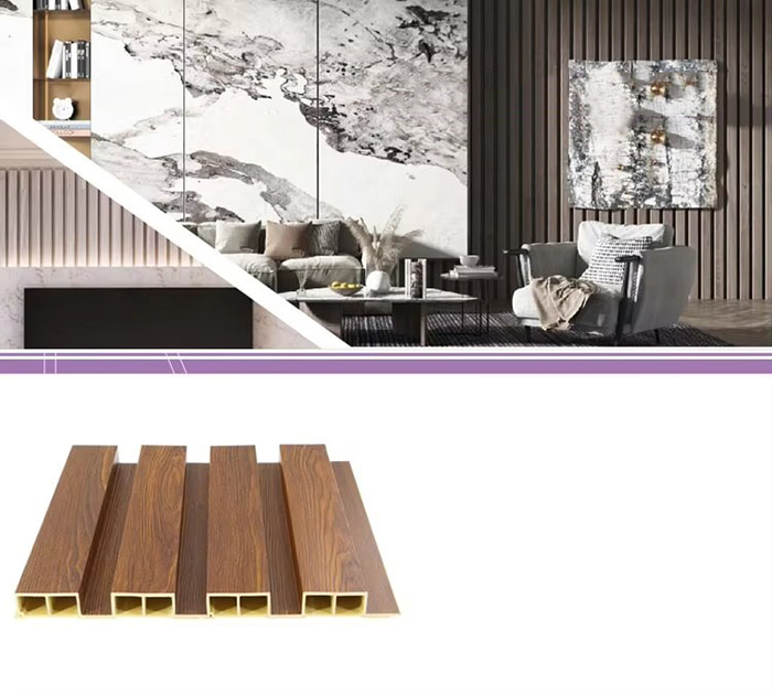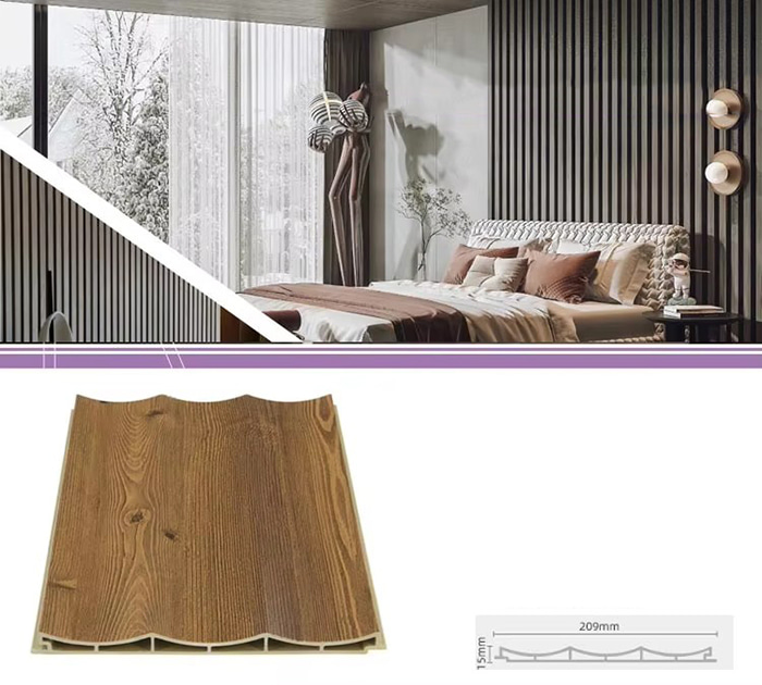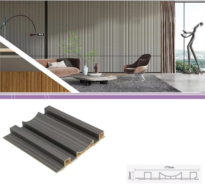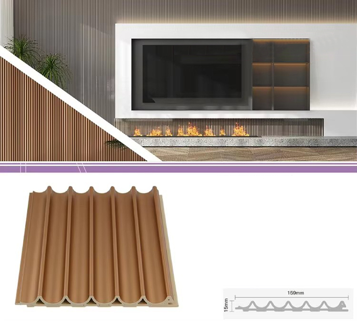 WPC unutarnje ploče ili drvene plastične kompozitne unutarnje ploče nova su vrsta ekološki prihvatljivog građevinskog materijala izrađenog od drvenih vlakana ili drvnog praha u kombinaciji s termoplastikom (poput polietilena, polipropilena ili polivinil klorida). Ovaj materijal izrađen je postupkom ekstruzije na visokoj temperaturi, a površina je obično ukrašena laminacijom, 3D ispisom ili laminacijom filma, pokazujući prirodnu teksturu i osjećaj sličan drvetu, dok također ima izdržljivost i otpornost na vremenske uvjete plastike. WPC unutarnje ploče ne samo da imaju prekrasan izgled drva, već i nadilaze nedostatke drva kao što su laka deformacija, upijanje vlage i truljenje, što ih čini idealnim materijalom za unutarnju dekoraciju