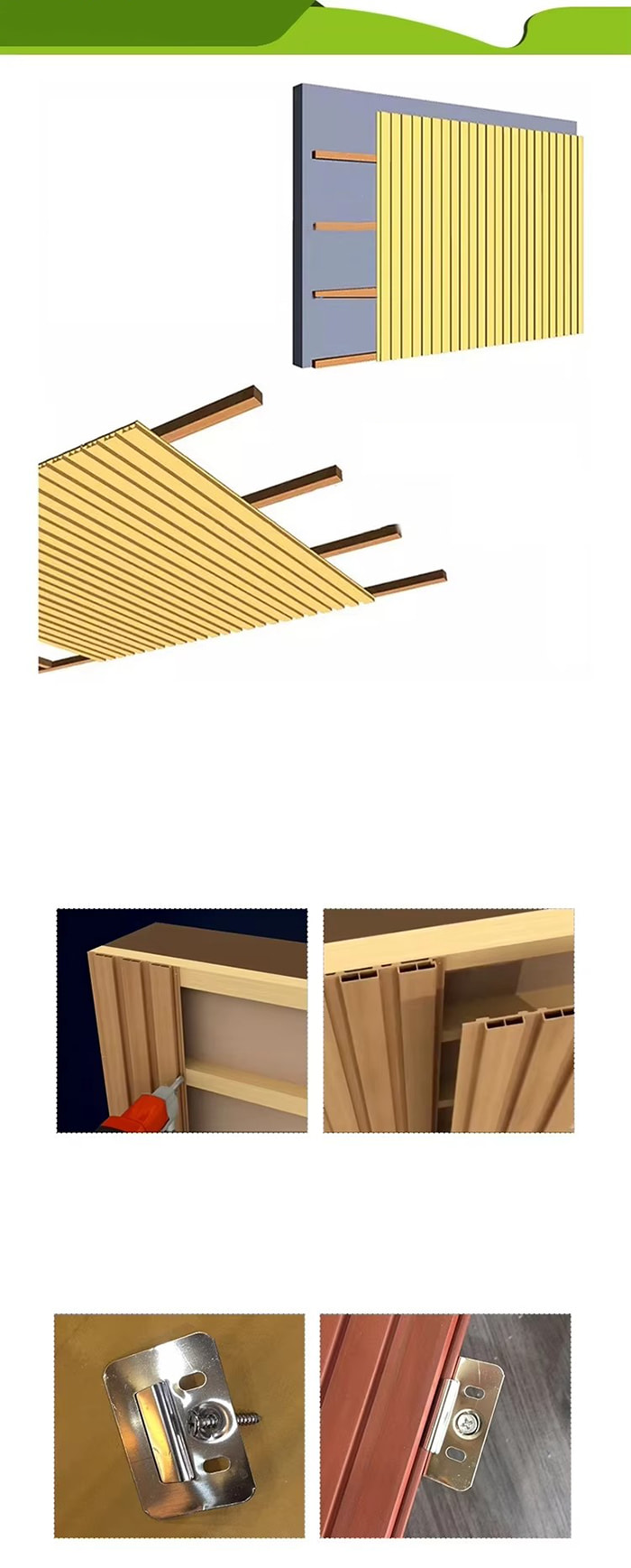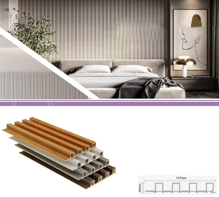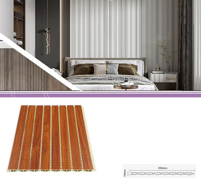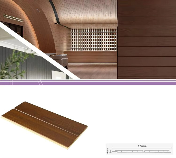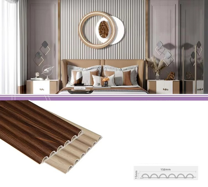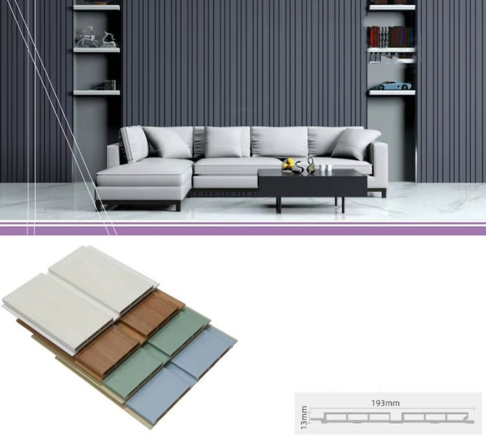 WPC unutarnje ploče ili drvene plastične kompozitne unutarnje ploče nova su vrsta ekološki prihvatljivog građevinskog materijala izrađenog od drvenih vlakana ili drvnog praha u kombinaciji s termoplastikom (poput polietilena, polipropilena ili polivinil klorida). Ovaj materijal izrađen je postupkom ekstruzije na visokoj temperaturi, a površina je obično ukrašena laminacijom, 3D ispisom ili laminacijom filma, pokazujući prirodnu teksturu i osjećaj sličan drvetu, dok također ima izdržljivost i otpornost na vremenske uvjete plastike. WPC unutarnje ploče ne samo da imaju prekrasan izgled drva, već i nadilaze nedostatke drva kao što su laka deformacija, upijanje vlage i truljenje, što ih čini idealnim materijalom za unutarnju dekoraciju